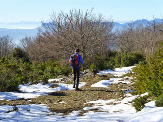 Seguimos una pista que se bifurca a la izquierda entrando en un bosque y cogiendo poco a poco altura de nuevo, para meternos en zona de boj, que, entre nieve, hace difícil distinguir el sendero. La dirección es correcta.