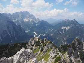 Retrocedemos a la ruta de subida y comenzamos a descender. Antes una última mirada al cresterío de la Cima de Cacciatore y a a más lejana cumbre del Mangart (frontera italoeslovena).